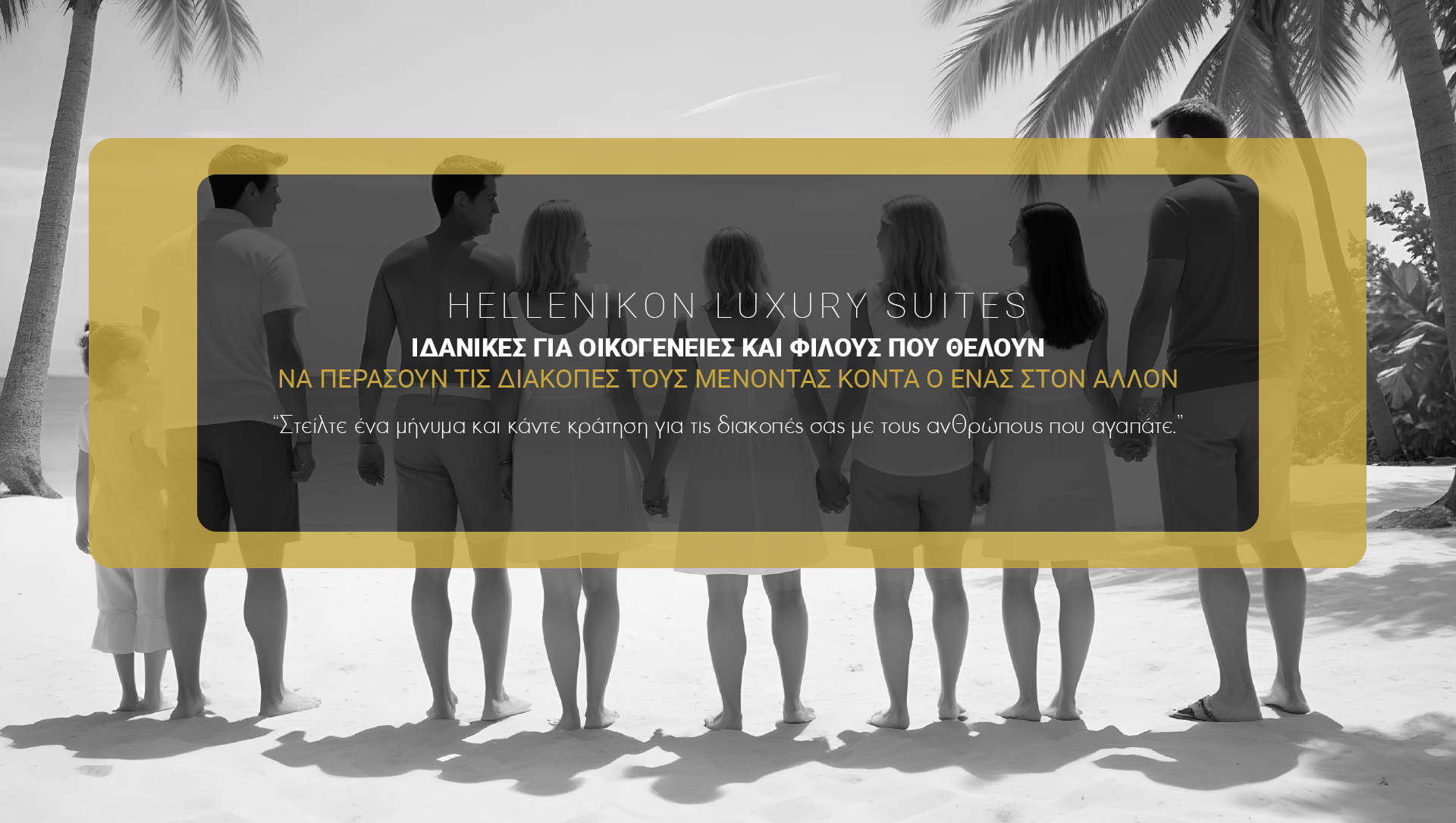 Σας περιμένουμε στις ανακαινισμένες “HELLENIKON LUXURY SUITES” ώστε να απολαύσετε μία εξαιρετική φιλοξενία με στόχο να έχετε τις καλύτερες αναμνήσεις από τις διακοπές σας στην Παραλία Κατερίνης.